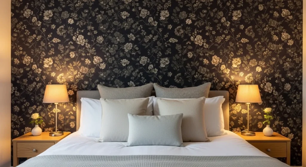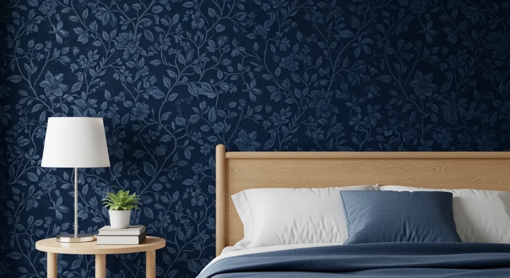 A navy floral wallpaper adds drama while remaining sophisticated. Dark petals and leaves create contrast against lighter furniture or linens, producing a layered and cozy effect. Metallic touches in the pattern catch light, giving walls subtle shimmer without overwhelming the room.