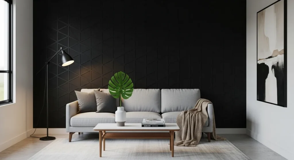 Matte black wallpaper provides a dramatic, contemporary backdrop. Texture ensures the wall does not feel flat or heavy, giving subtle dimension while maintaining mystery and depth. Ideal for feature walls or behind furniture clusters.