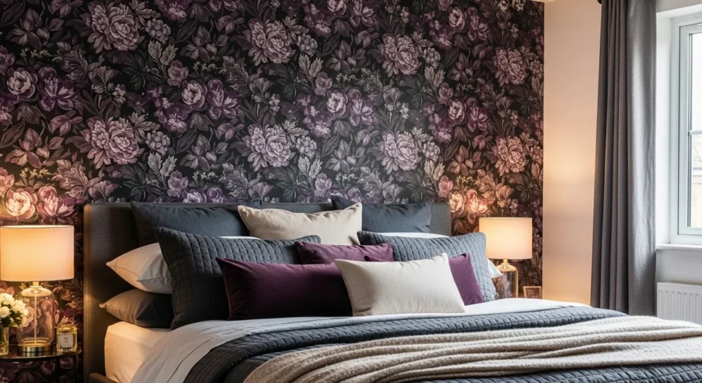 15. Deep Aubergine Floral Wallpaper for Luxurious, Enveloping Bedrooms