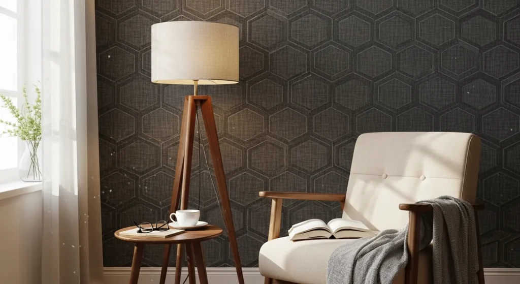 Charcoal geometric wallpaper introduces depth through shape rather than color. Angled or repeating patterns add visual interest without disrupting the intimate mood of a room. This style works well in small reading nooks or accent walls.