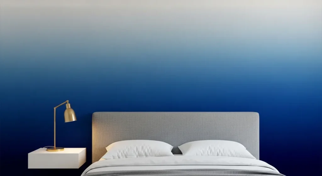 Ombre wallpaper in deep blue tones adds layered visual interest. The gradual shift in hue prevents walls from appearing too heavy while maintaining moody elegance. It works particularly well in bedrooms or small spaces that benefit from both depth and light flow.