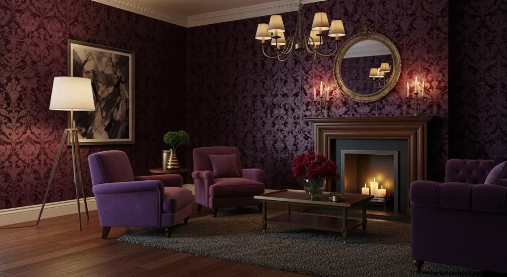 Aubergine tones create a deep, rich backdrop that feels both luxurious and intimate. Floral patterns add texture and visual interest, softening the intensity of the dark color while drawing the eye to details in the room. Ideal for bedrooms or private lounges.