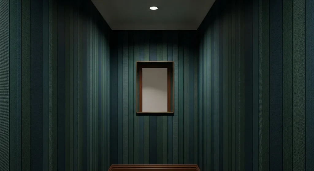 Dark teal stripes add visual height and depth to a room while maintaining a moody atmosphere. Subtle texture prevents the stripes from feeling flat, giving walls a layered dimension. This approach works well in entryways, hallways, or small living areas.
