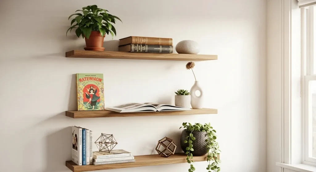 Styling is important for this type of display. A balanced mix of books, small plants, and sculptural decor objects keeps the shelves visually interesting without overwhelming the wall. Leave small areas of empty space on each shelf so the arrangement feels light and breathable instead of crowded.