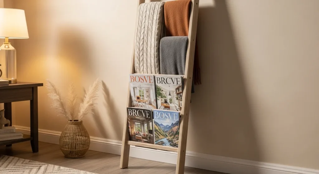 Use the ladder to display throws, small blankets, or magazines to add texture and personality. Keeping the styling minimal prevents the corner from feeling crowded. The ladder becomes a functional decor element that adds height and warmth without requiring permanent installation.