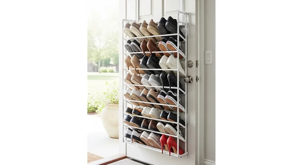 An over-the-door shoe rack keeps footwear organized and off floors. This simple solution works for apartments, closets, or mudrooms, freeing space and reducing clutter. Mesh or fabric pockets provide flexibility for different shoe sizes.