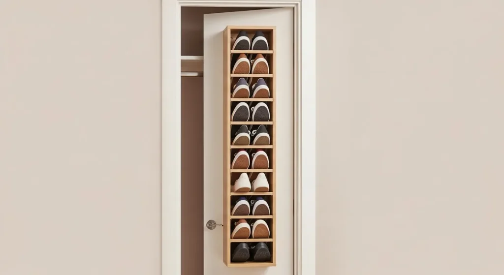 A slim shoe cubby mounted behind a closet or bedroom door keeps shoes neatly stored and out of sight. Vertical storage allows several pairs to fit in a compact space, which is perfect for small rooms or apartments.
