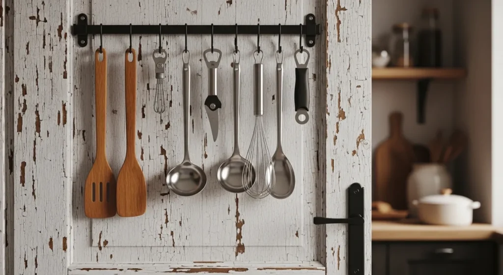 Mounting a utensil rack behind a kitchen door keeps tools within easy reach while freeing drawer and counter space. Hooks or small rails can hold spatulas, tongs, whisks, and other frequently used utensils.