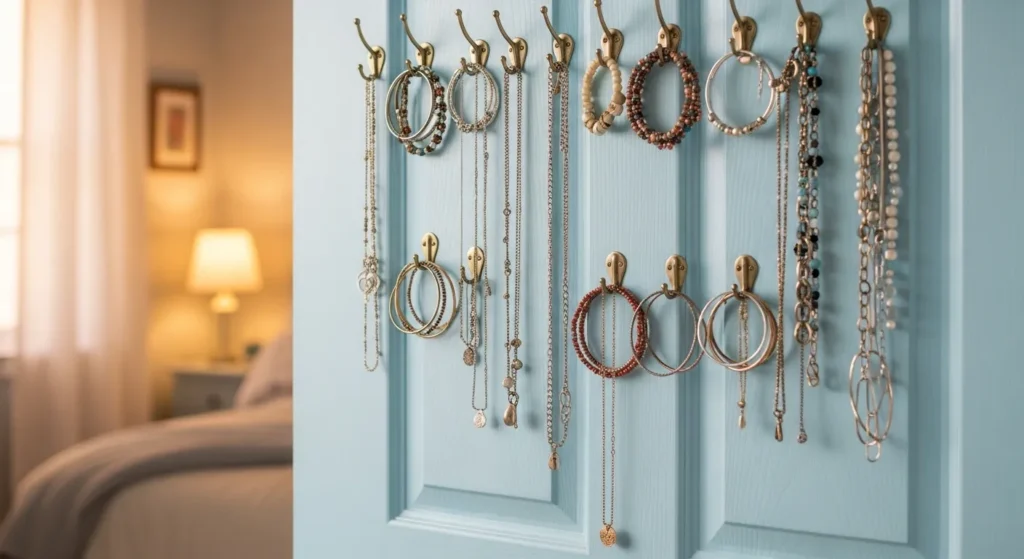 Small hooks mounted on a door keep necklaces, bracelets, and chains tangle-free. Items remain visible, making it easy to choose accessories quickly. This simple adjustment turns unused space into a practical storage wall.