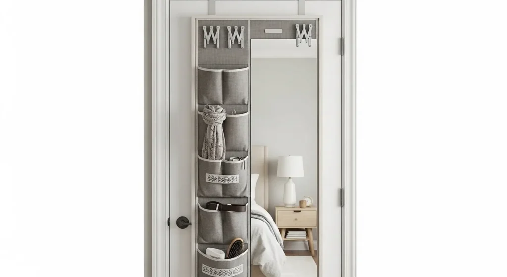 A full-length mirror mounted on a door can double as storage by adding hooks or small pouches behind it. Jewelry, scarves, belts, or small accessories can be stored efficiently while the mirror serves a functional purpose.