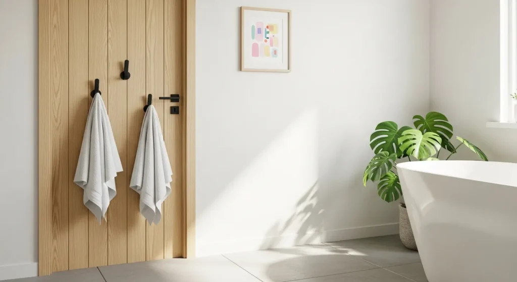 Installing hooks behind bathroom doors keeps towels within reach while clearing wall and floor space. Multiple hooks allow separate storage for family members or guests, keeping the bathroom tidy.