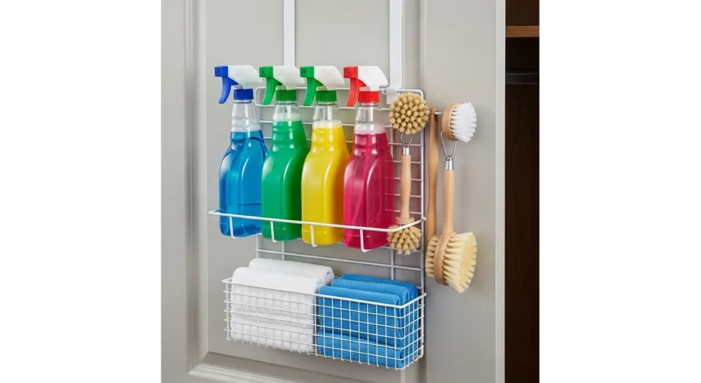 A caddy mounted behind a door keeps cleaning supplies accessible yet hidden. Spray bottles, cloths, and brushes can be organized neatly, freeing cabinet or counter space. Adjustable compartments allow for bottles of different sizes.