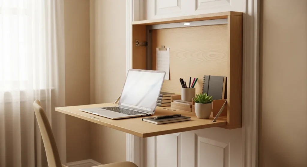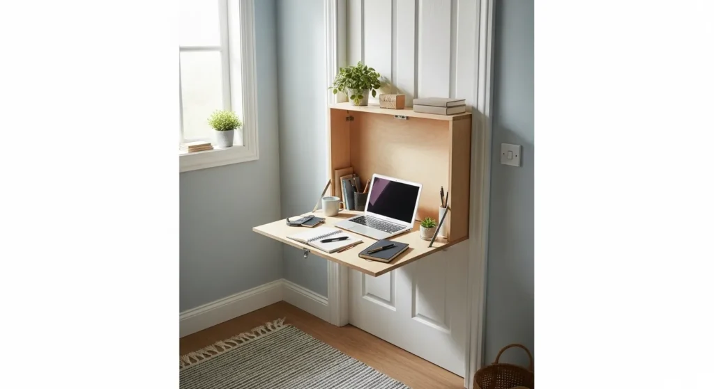 A folding desk mounted behind a door creates a compact workspace in tight areas. When not in use, it folds flat to remain hidden. This is perfect for small apartments or home offices.
