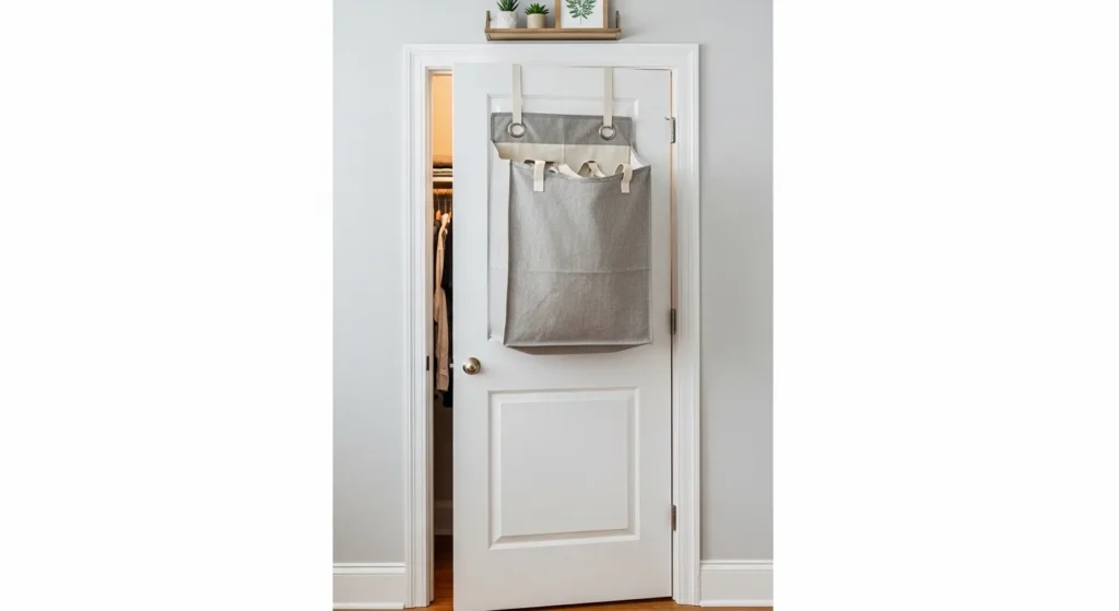 An over-the-door laundry hamper keeps clothes off the floor while remaining hidden. Mesh or canvas bags allow airflow and are lightweight for easy removal. This is especially useful in small bedrooms or laundry rooms.