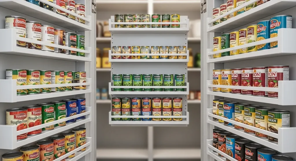 Slim shelves on the pantry door can store cans, jars, or small snacks. Adjustable units let you change spacing to fit taller or shorter items, making full use of vertical space.