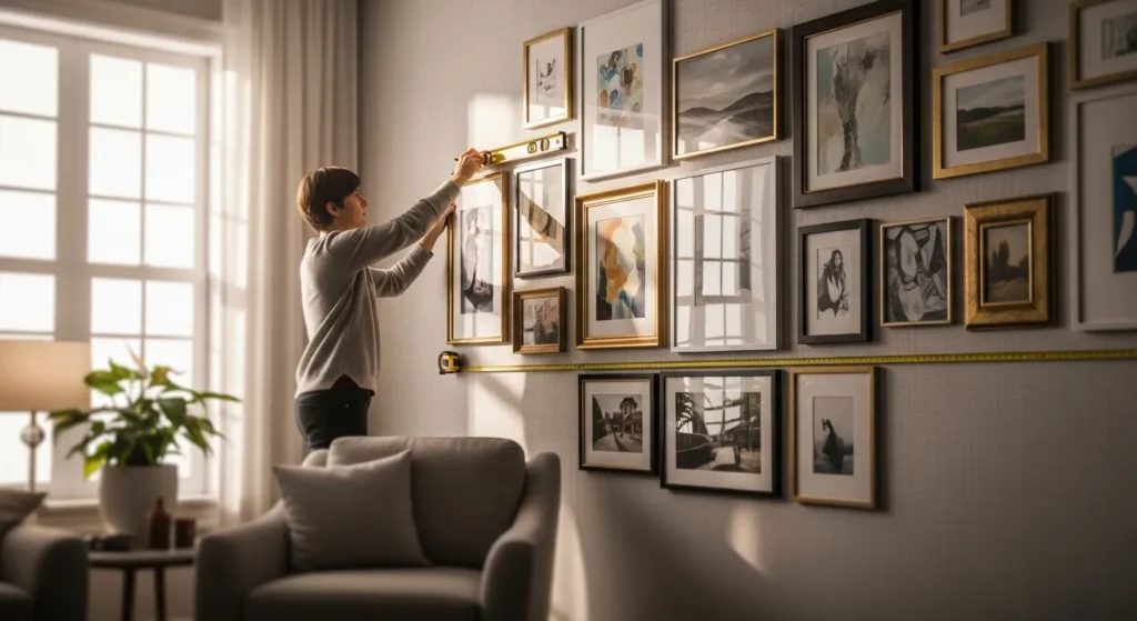 Always use a spirit level, measuring tape, and pencil marks to ensure every frame is straight and evenly spaced. This small step prevents frustration and creates a polished, professional-looking arrangement.