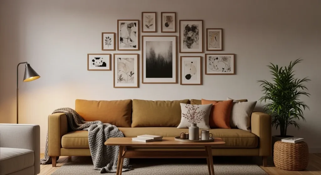 Scale your frames and layout to suit the wall size. Proper proportions create a gallery wall that feels integrated, polished, and comfortable to view.
