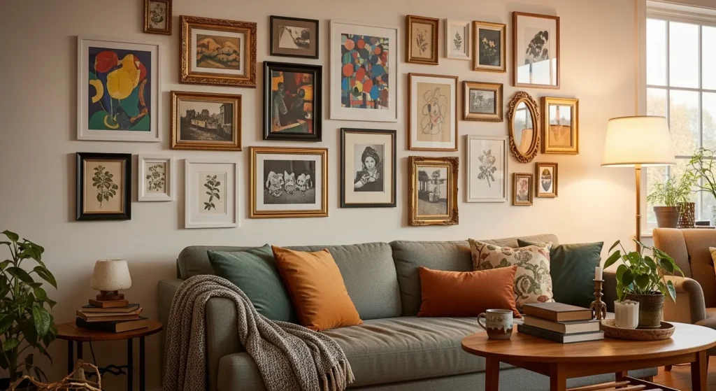 Consider the room’s natural light and supplement with wall sconces or track lighting if needed. Proper illumination highlights your artwork, adds depth, and enhances the cozy ambiance of the space.