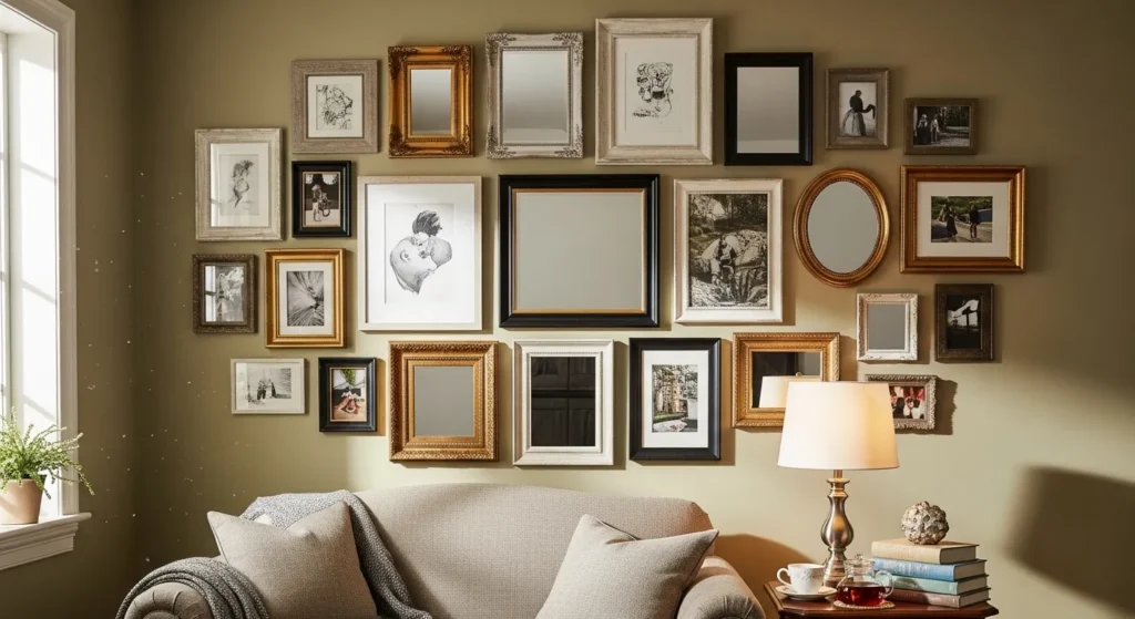 Mixing too many frame styles, colors, or finishes without a unifying element creates a disjointed look. The wall can appear chaotic and unplanned.