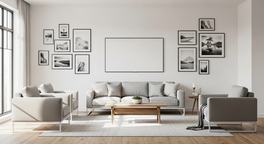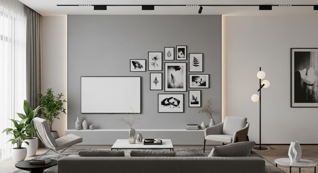 Stick to one or two frame colors and avoid overly bright or busy prints. Neutral palettes allow the TV to blend seamlessly into the wall rather than fight for attention.