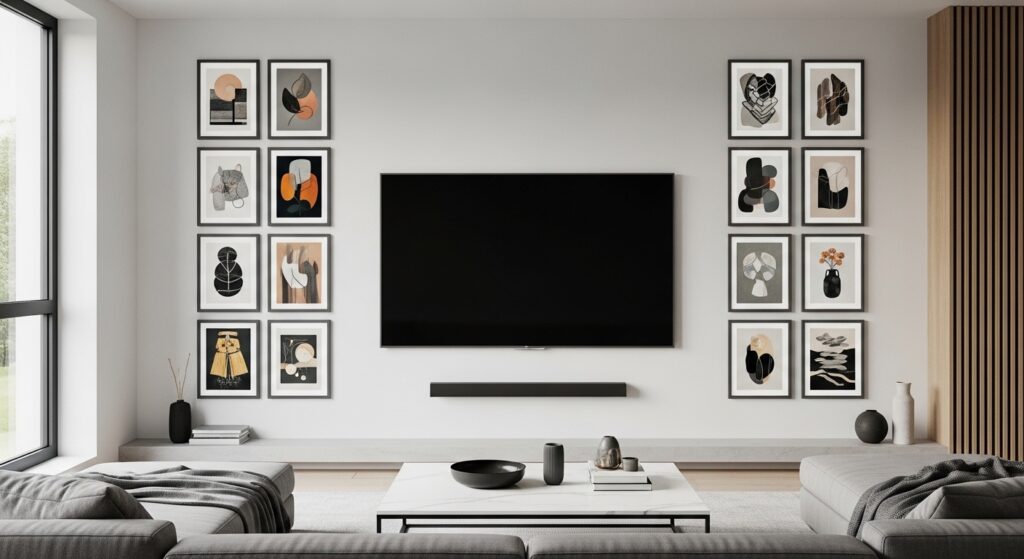 Use 2–3 rows above and beside the TV for balance. Stick to uniform colors or themes to keep the grid cohesive. This approach works best in modern, minimalist interiors.
