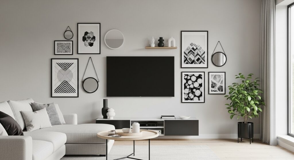 Whether you choose symmetrical grids, layered shelves, or asymmetrical clusters, black and white art keeps the look cohesive. The result is a modern, polished wall that makes a bold statement while keeping your TV integrated seamlessly.