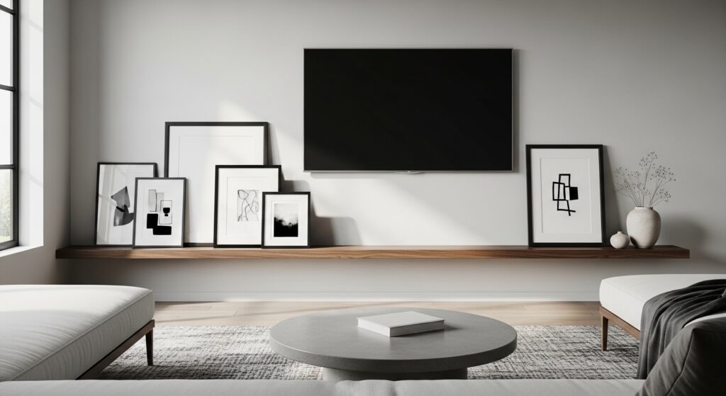 Keep the shelf width slightly shorter than the TV for balance. Minimal objects between frames help maintain a clean, airy gallery wall.