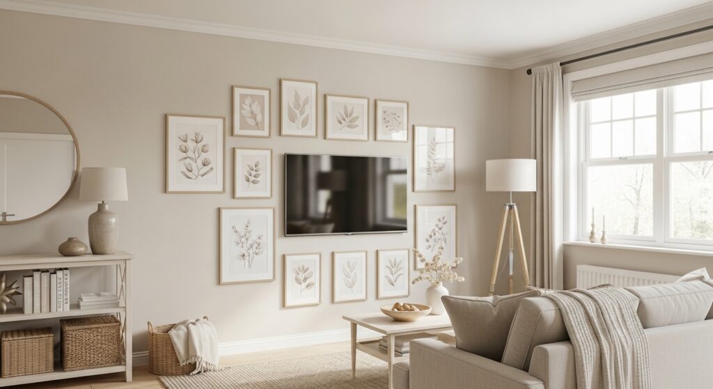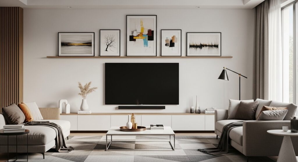 A compact cluster above the TV adds interest without overwhelming the wall. Grouping 3–5 small prints creates a focal area and draws the eye upward.
