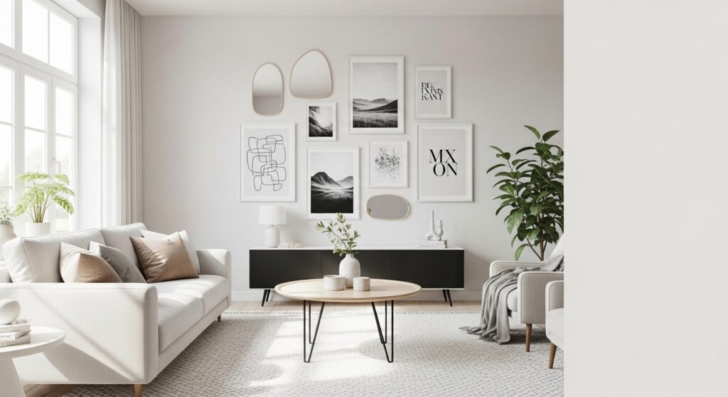 Combining prints with subtle decorative objects creates dimension and personality. Mixed media keeps the gallery visually engaging while maintaining harmony.