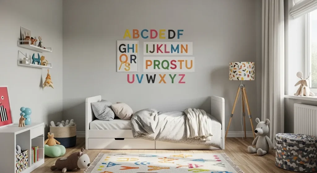 Alphabet wall art combines learning and decoration. Bright, colorful letters displayed on the wall help children recognize letters while adding a lively and fun visual element to the room.