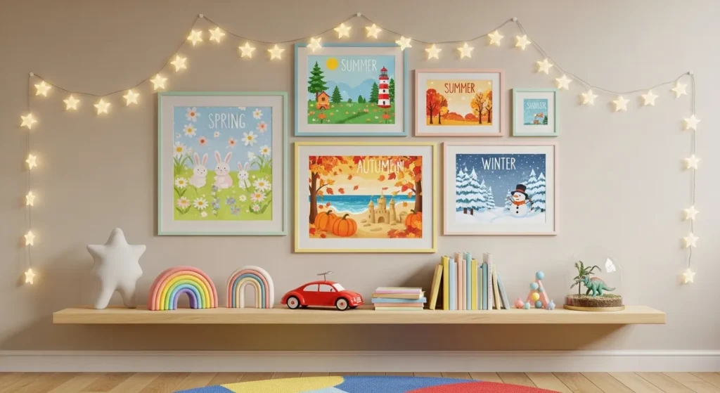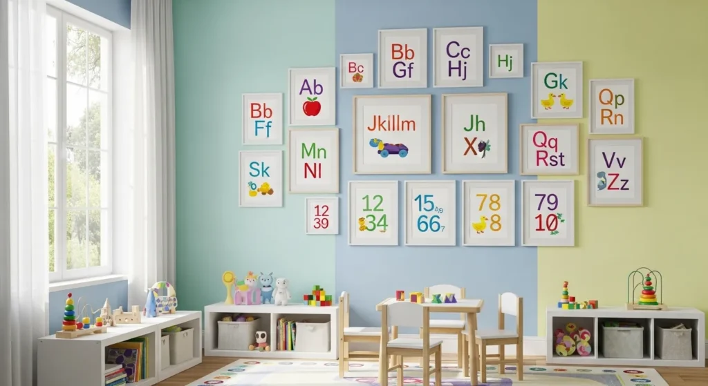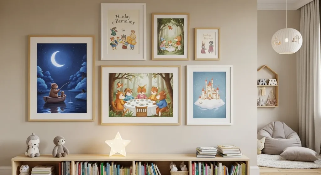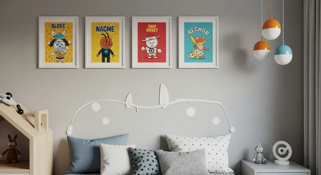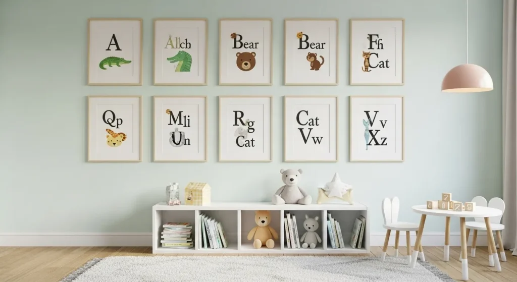 Mixing different designs in similar frames ensures the wall looks curated. Placing the art above a play table or reading nook adds a thematic focus area that blends learning with decoration.