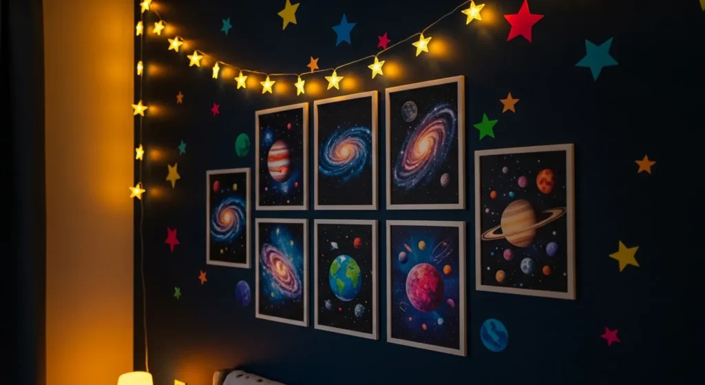Choose prints with bold colors like deep blues, purples, and pops of gold or silver. Arranging multiple prints along a staircase wall or above the bed creates a cohesive “galaxy corner” that feels fun and inspiring.