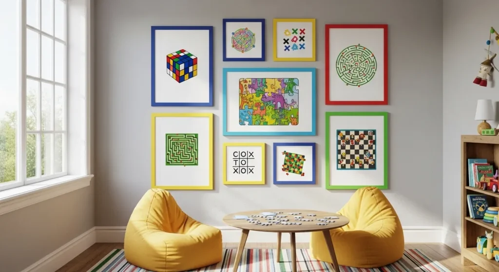 Artwork inspired by puzzles, mazes, or games makes the wall interactive and playful. These prints invite children to engage with the room’s decor while subtly encouraging problem-solving skills.