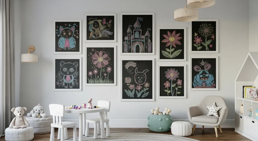 Use chalkboards in a gallery arrangement or alongside framed prints. This setup lets children experiment with colors and shapes while giving parents the flexibility to rotate the artwork as needed.