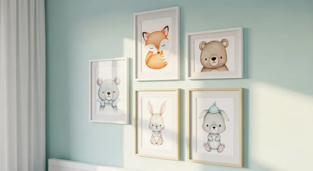 Mix different animal illustrations in varying sizes and frames to create a mini-gallery effect. Using soft pastel colors can add a calming vibe, while brighter hues make the wall pop and engage children visually.