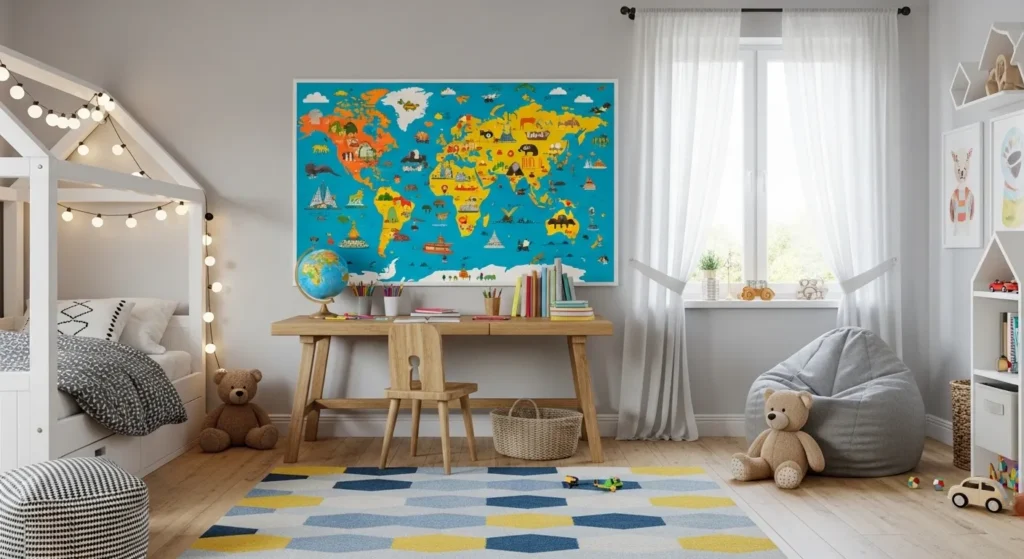 Opt for a colorful illustrated map with animals, landmarks, or fun icons. Hanging it at eye level above a desk or study corner creates an engaging focal point that can grow with your child.