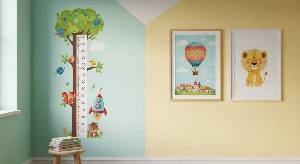Growth charts are practical and decorative. A wall-mounted growth chart allows you to track your child’s height while enhancing the wall visually with themed designs.