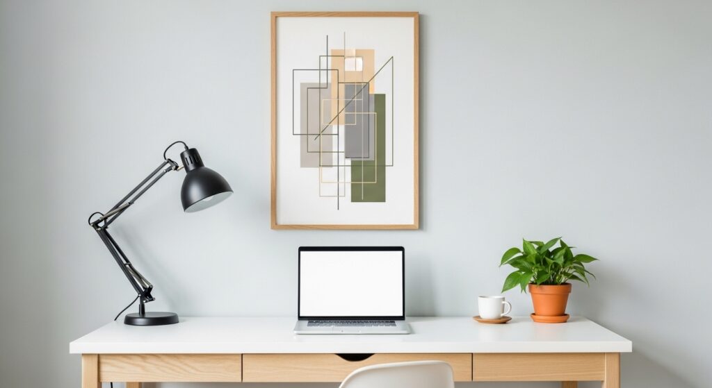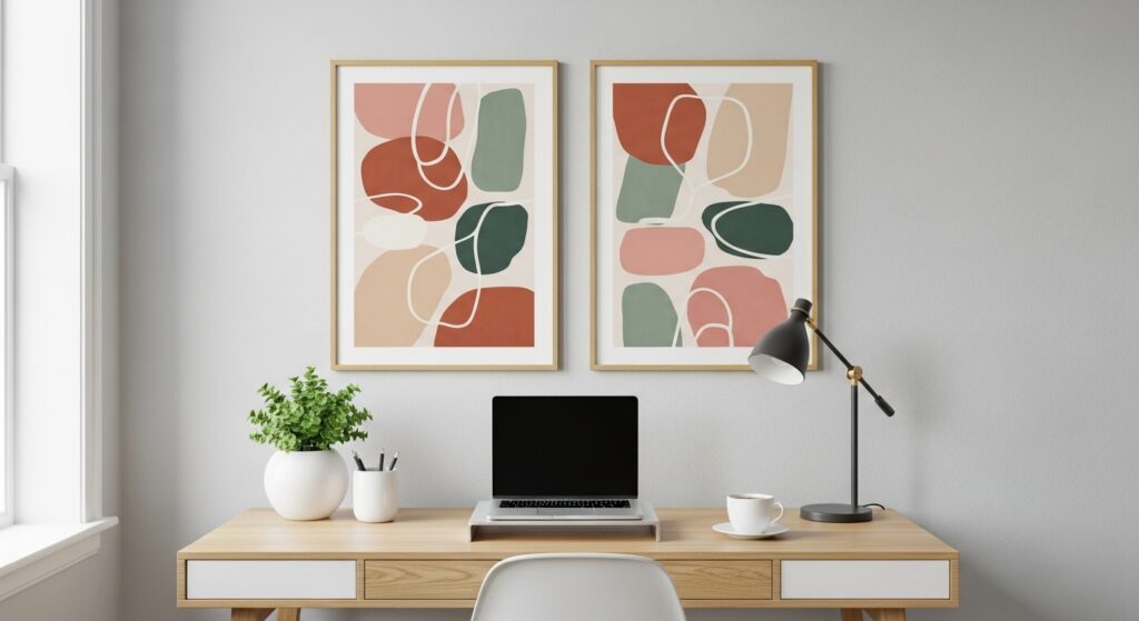 Minimalist abstract prints add visual interest without cluttering the workspace. Soft shapes and neutral colors enhance focus while providing an aesthetically pleasing backdrop.