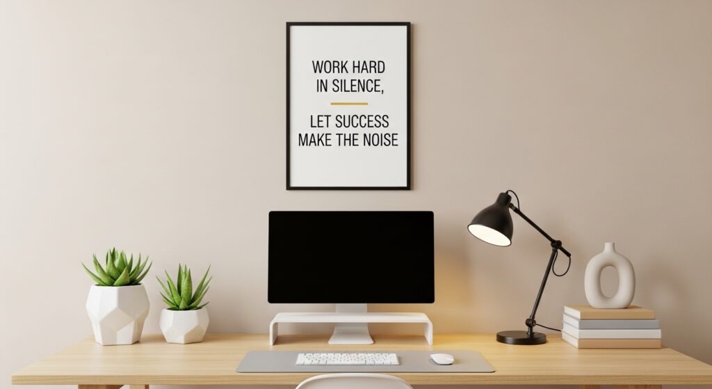 Motivational typography instantly draws attention and sets a productive tone. Bold, legible fonts in simple colors encourage focus while keeping the space professional and stylish.