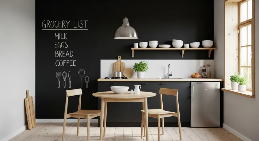 A chalkboard wall adds function and creativity to small spaces. It’s perfect for kitchens, entryways, or home offices where notes, doodles, or daily schedules can be displayed, transforming a simple wall into a dynamic focal point.