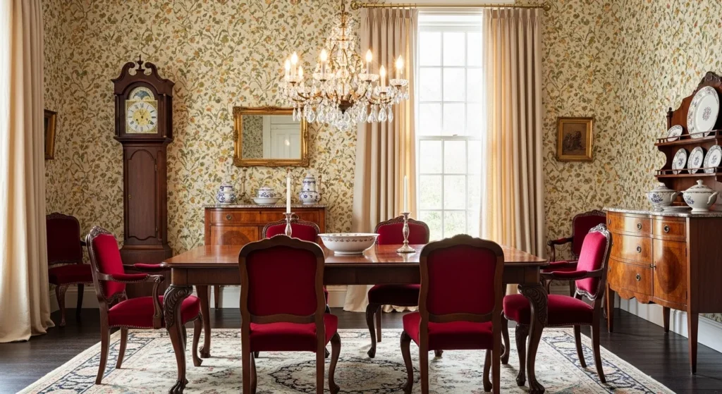 Use wallpaper to create authenticity in classic rooms. Paint complements the style but usually lacks the intricate visual detail needed for fully vintage-inspired interiors.