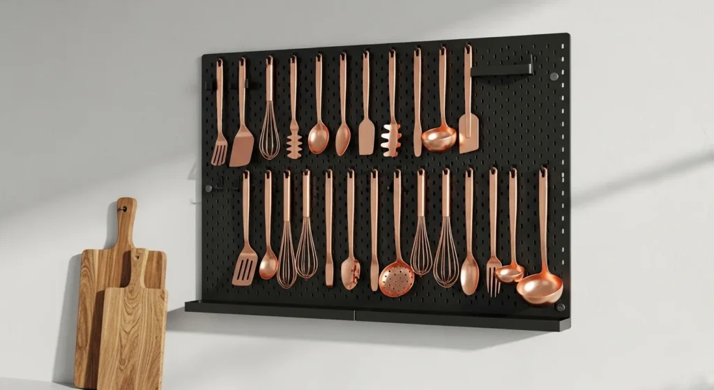 A black pegboard adds dramatic contrast against a light wall or backsplash. Hanging copper or brass utensils against the dark background makes each piece stand out while giving the kitchen a modern, industrial feel.