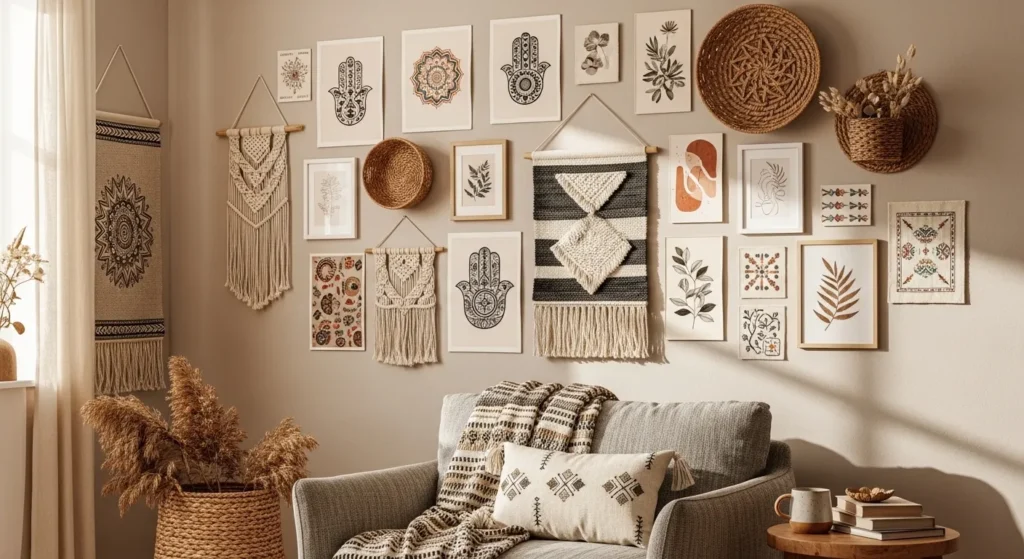 Start with a central piece like a woven hanging or large print and layer smaller items around it. Maintaining a consistent color palette of neutrals with muted accents prevents chaos. The result is a gallery wall that feels creative, lively, and cozy.