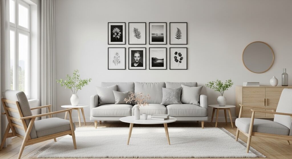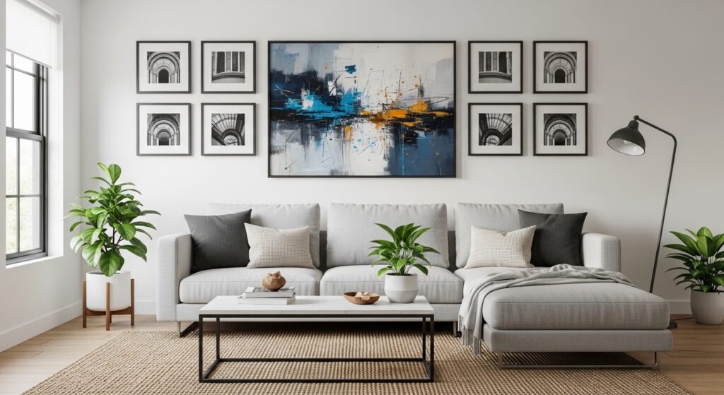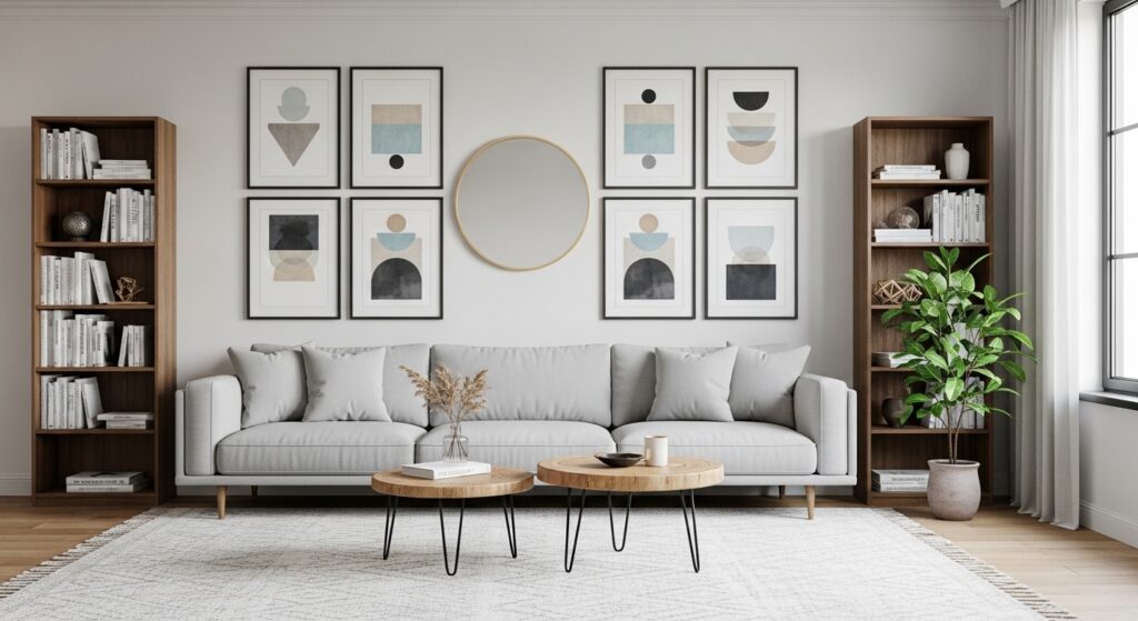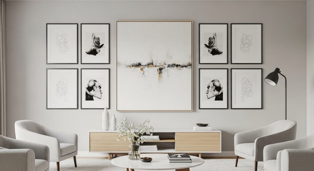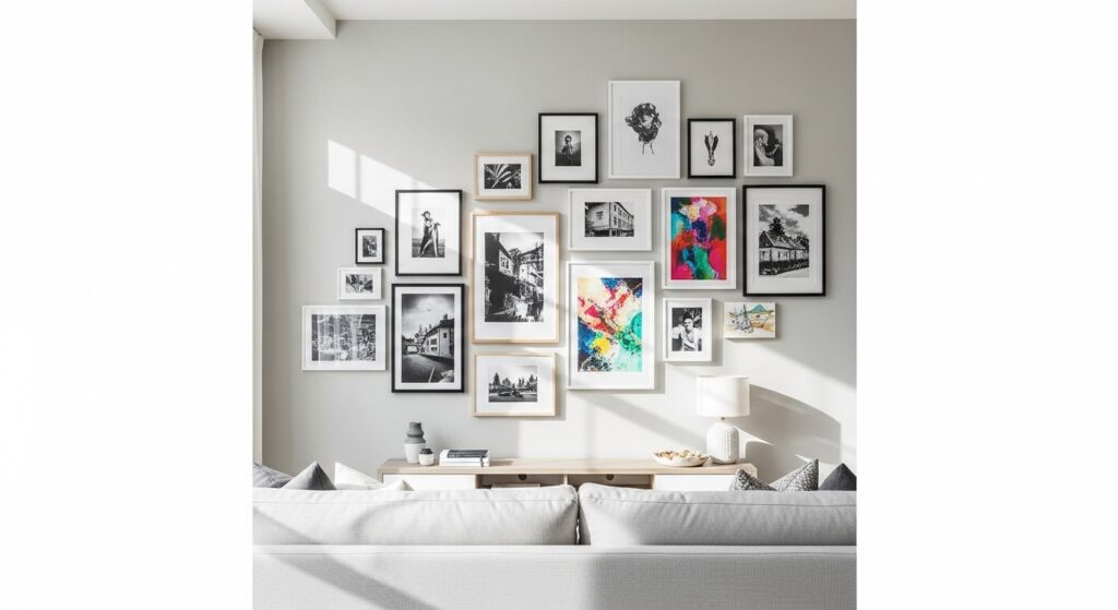 Keep frame styles uniform and spacing consistent. This method works well for medium to large walls and ensures the gallery feels intentional, not cluttered.
