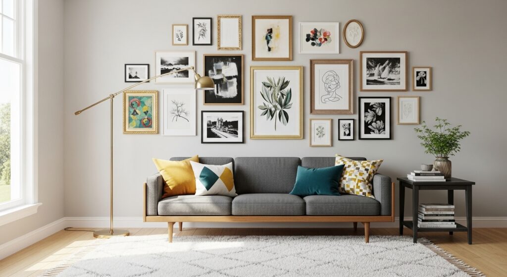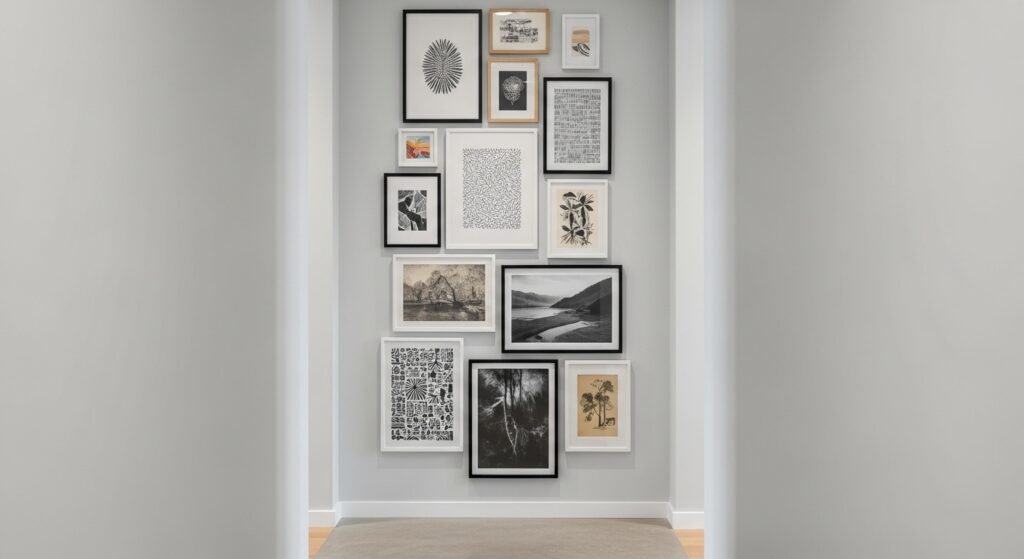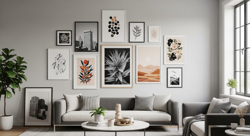 Eclectic gallery walls embrace variety and personality. Mixing frame sizes, styles, and artwork types creates energy and character. The wall becomes a curated expression of taste rather than a formal display.