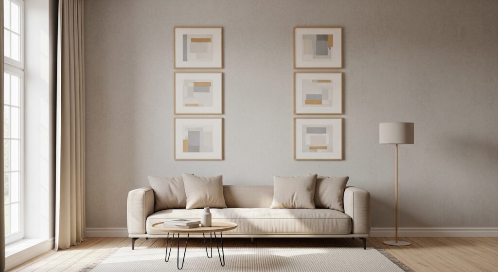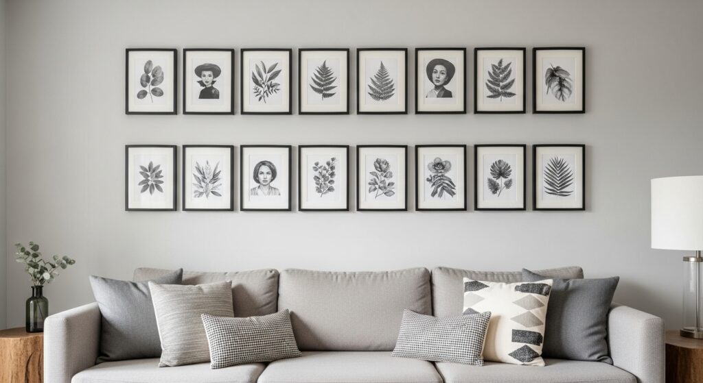 Use identical frames and consistent spacing. This method works well for narrower walls or spaces where horizontal grids aren’t practical. The result feels structured and elegant.