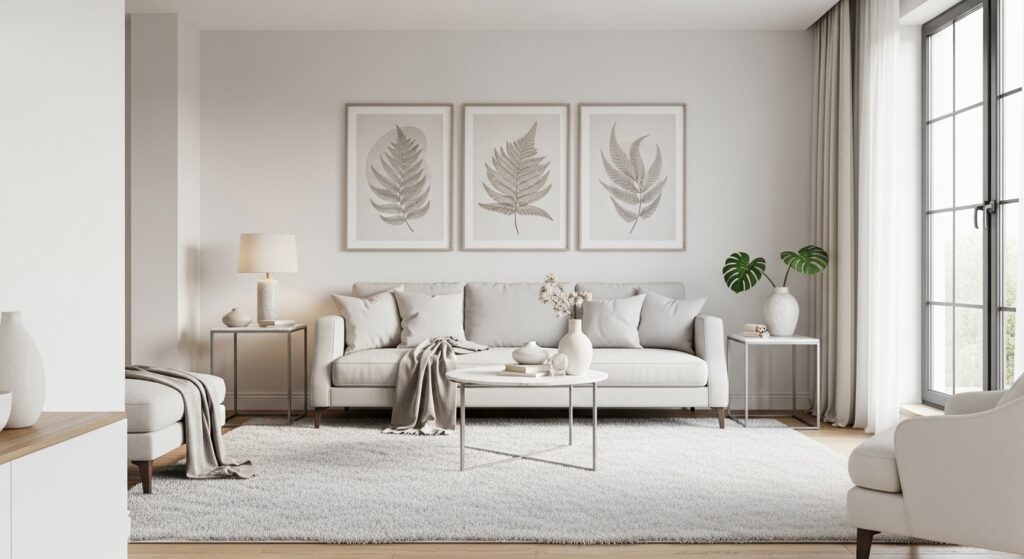 Using a central anchor piece creates focus. Smaller matching prints on either side balance the arrangement, resulting in a polished, harmonious look.