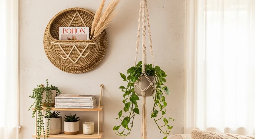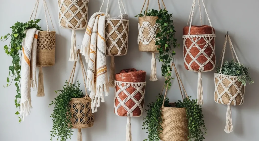 Use different heights for a layered effect. Mix woven baskets with macramé plant hangers for a dynamic boho style. This solution is practical, visually appealing, and Pinterest-ready for living rooms or bedrooms.