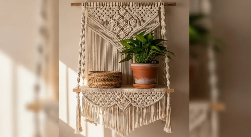 Macramé shelves provide small platforms for baskets, jars, or decor items. The woven design adds texture while the basket keeps essentials organized and tidy.