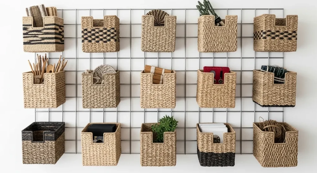 Arranging baskets in a grid creates an organized yet decorative wall display. Each basket can hold household items, craft supplies, or small accessories, keeping clutter off counters and tables.